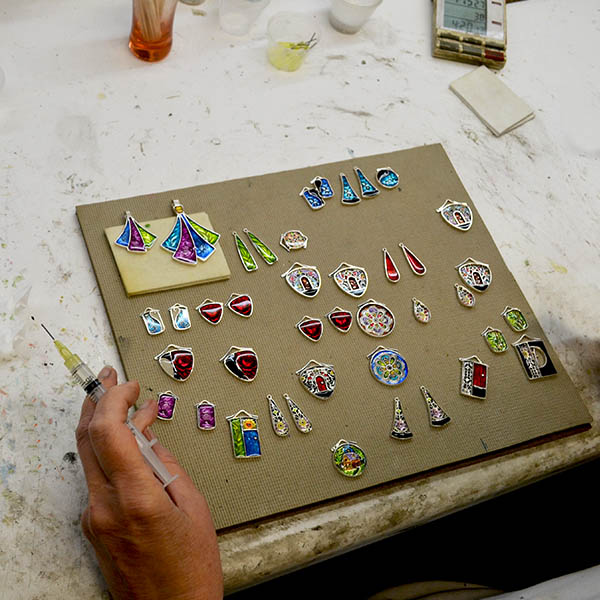 The heat-set epoxy resin is colored with transparent pigments and carefully applied over